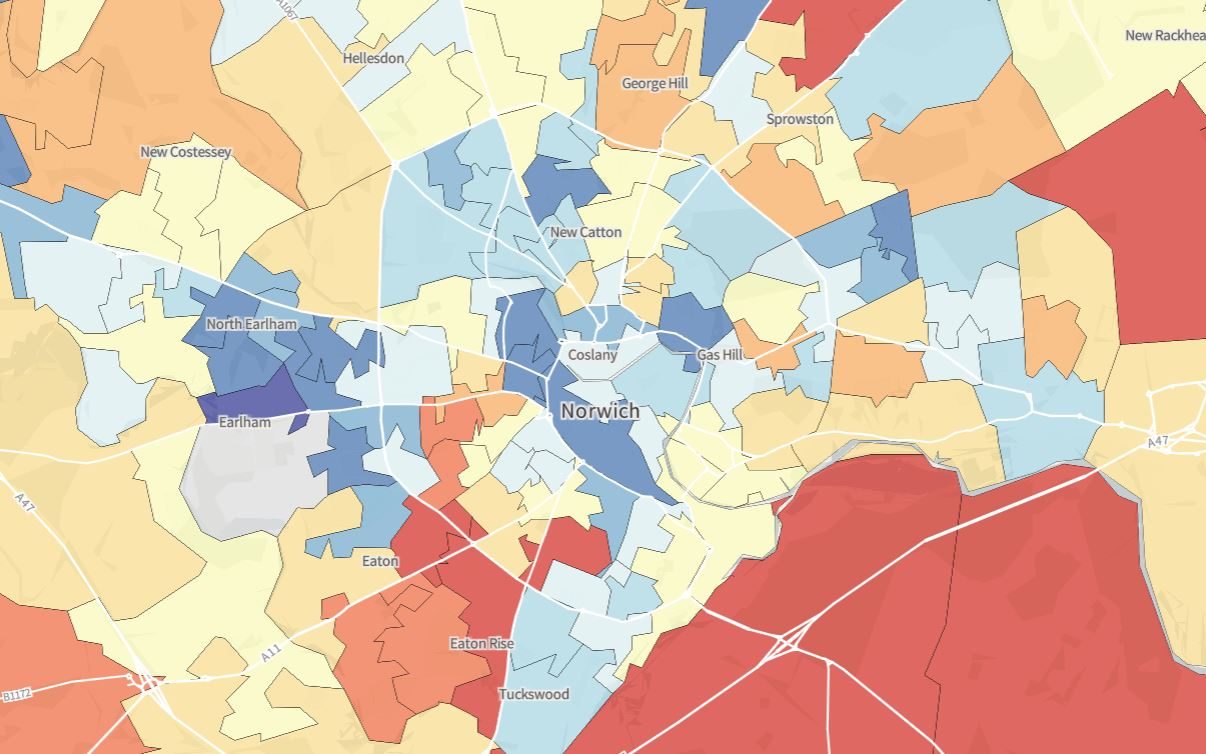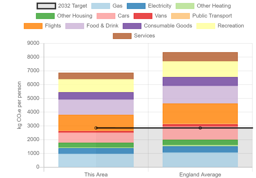 Norwich’s emissions are below the national average, but to keep us within 1.5°C of warming there is still plenty of progress left to make. The graph below from carbon.place shows this challenge in full: the bar on the right shows the average Norwich resident’s current emissions, and the black line is where we need to get to.